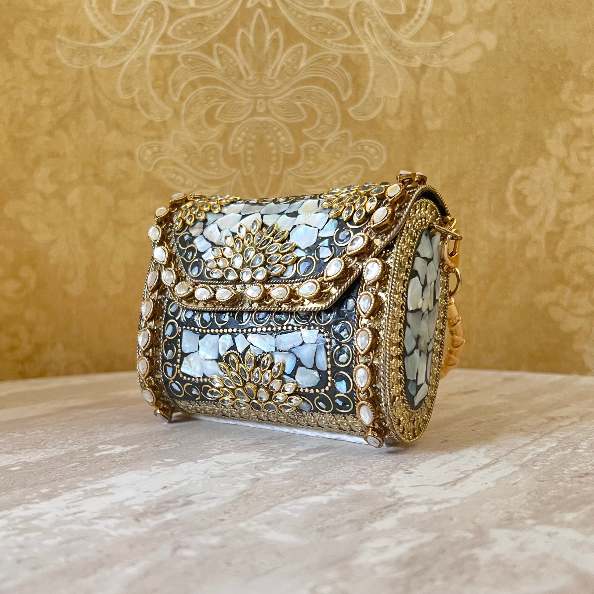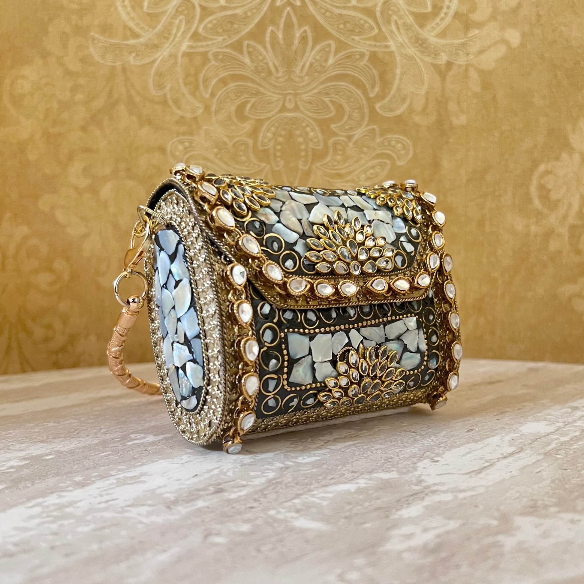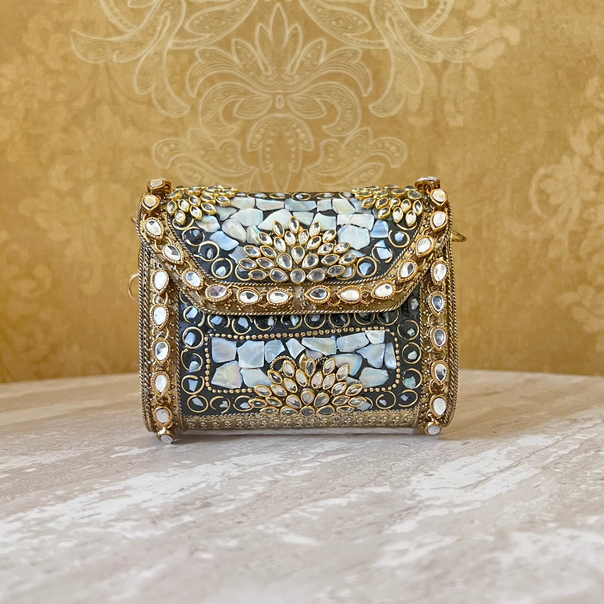 Crafted with a shimmering metallic base, this clutch is lavishly adorned with radiant kundan stones. The color scheme blends gold and silver tones.